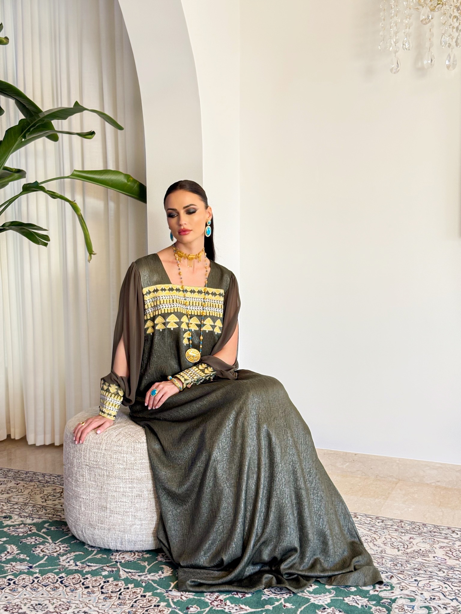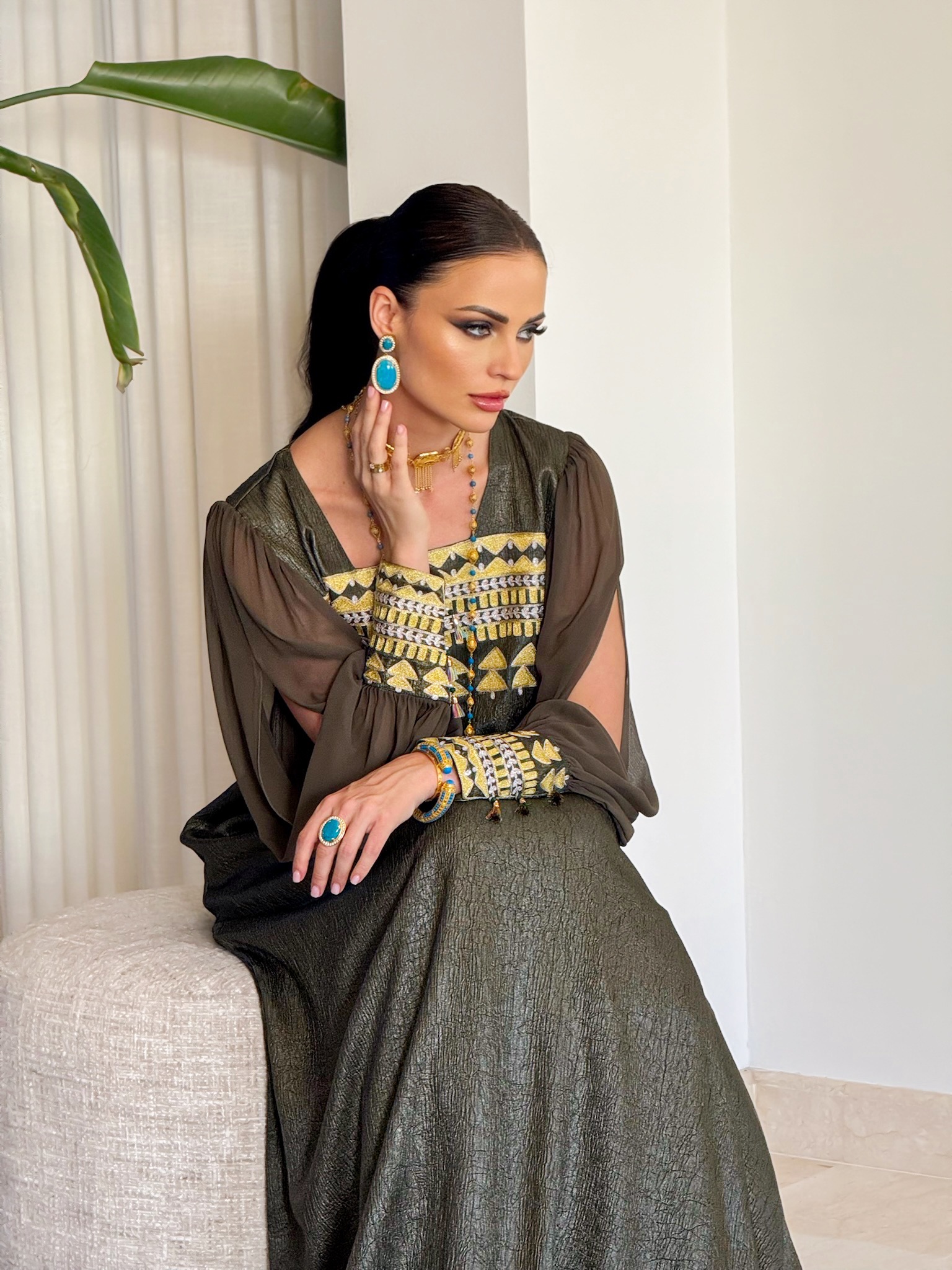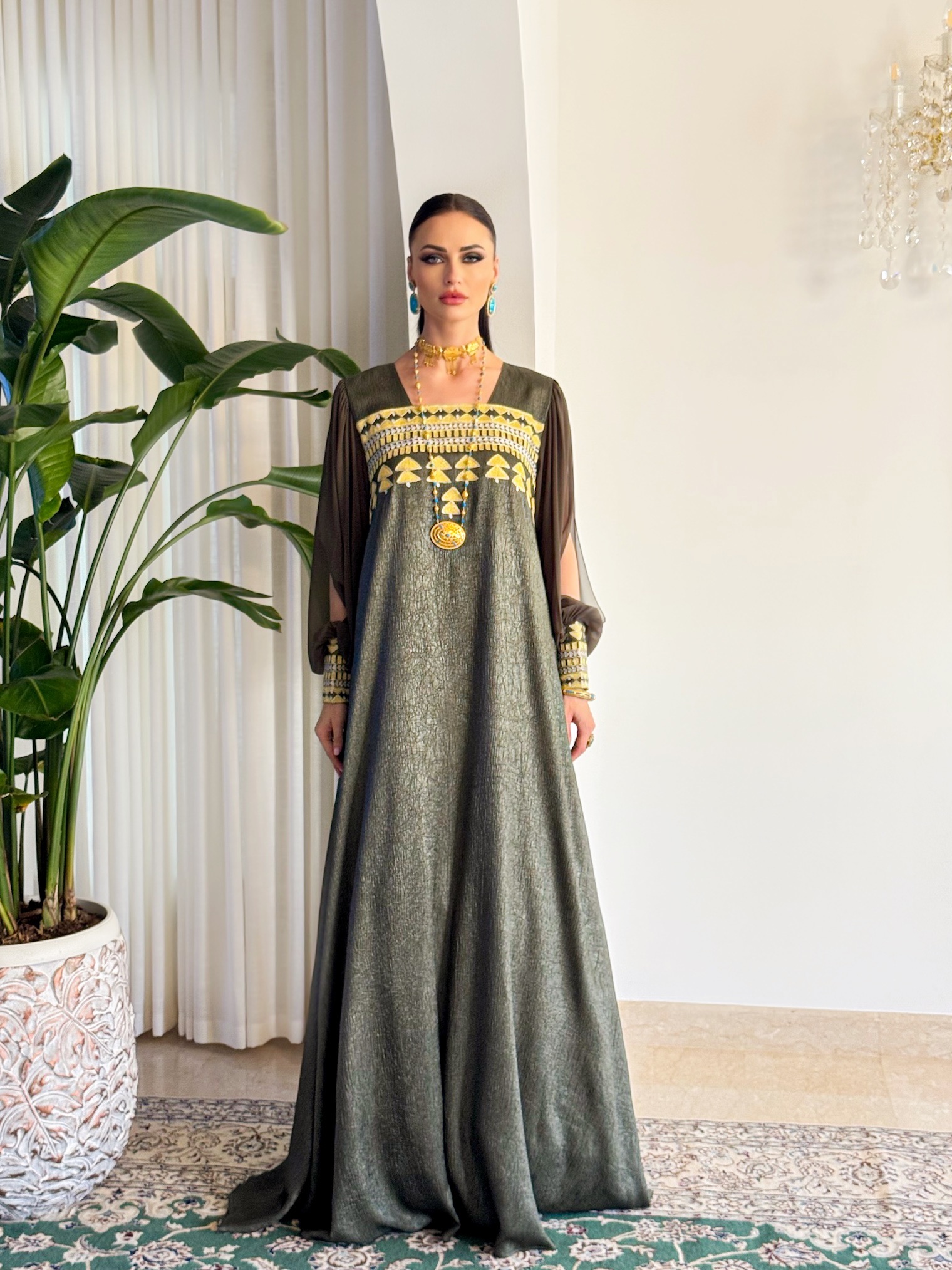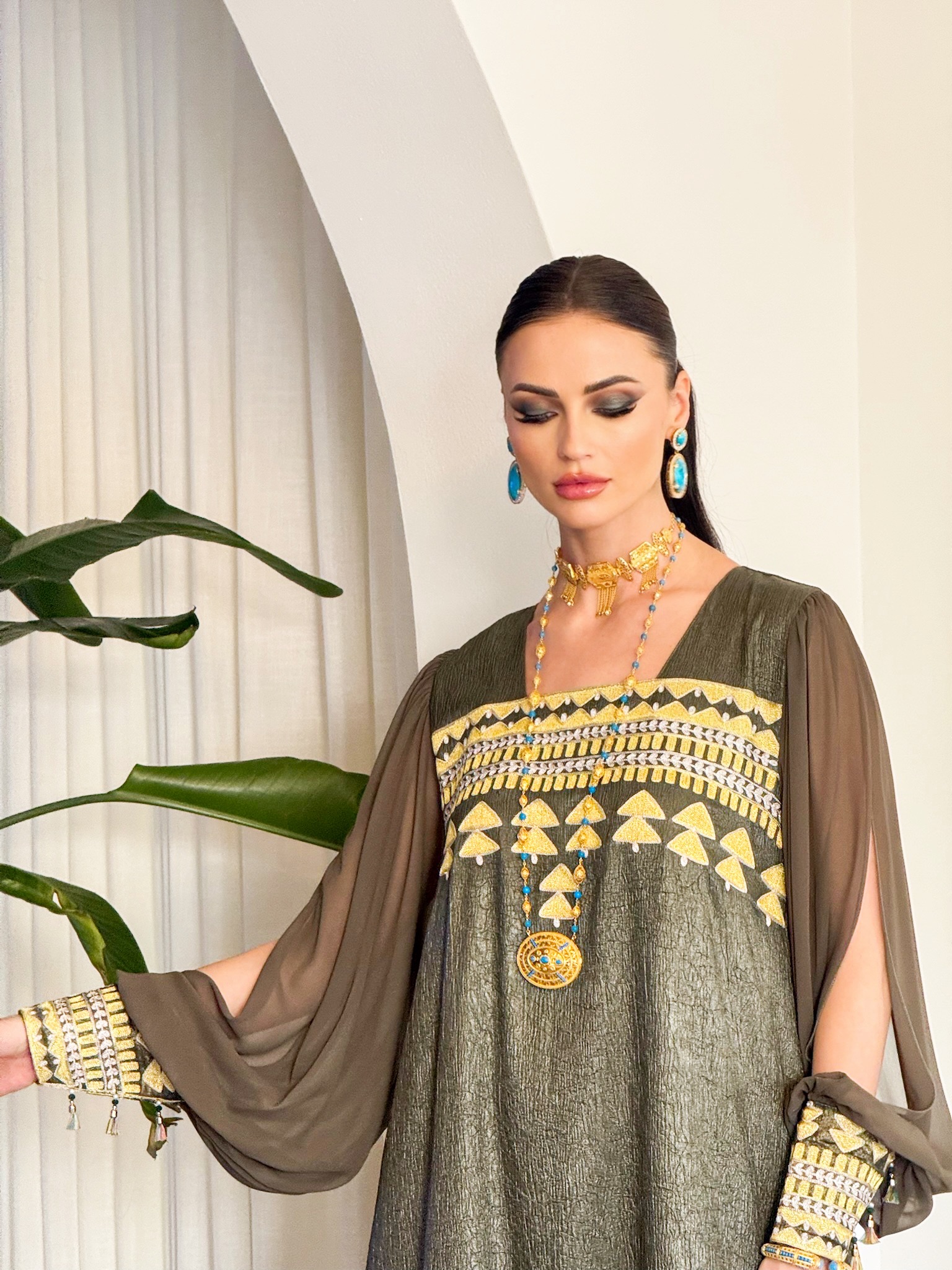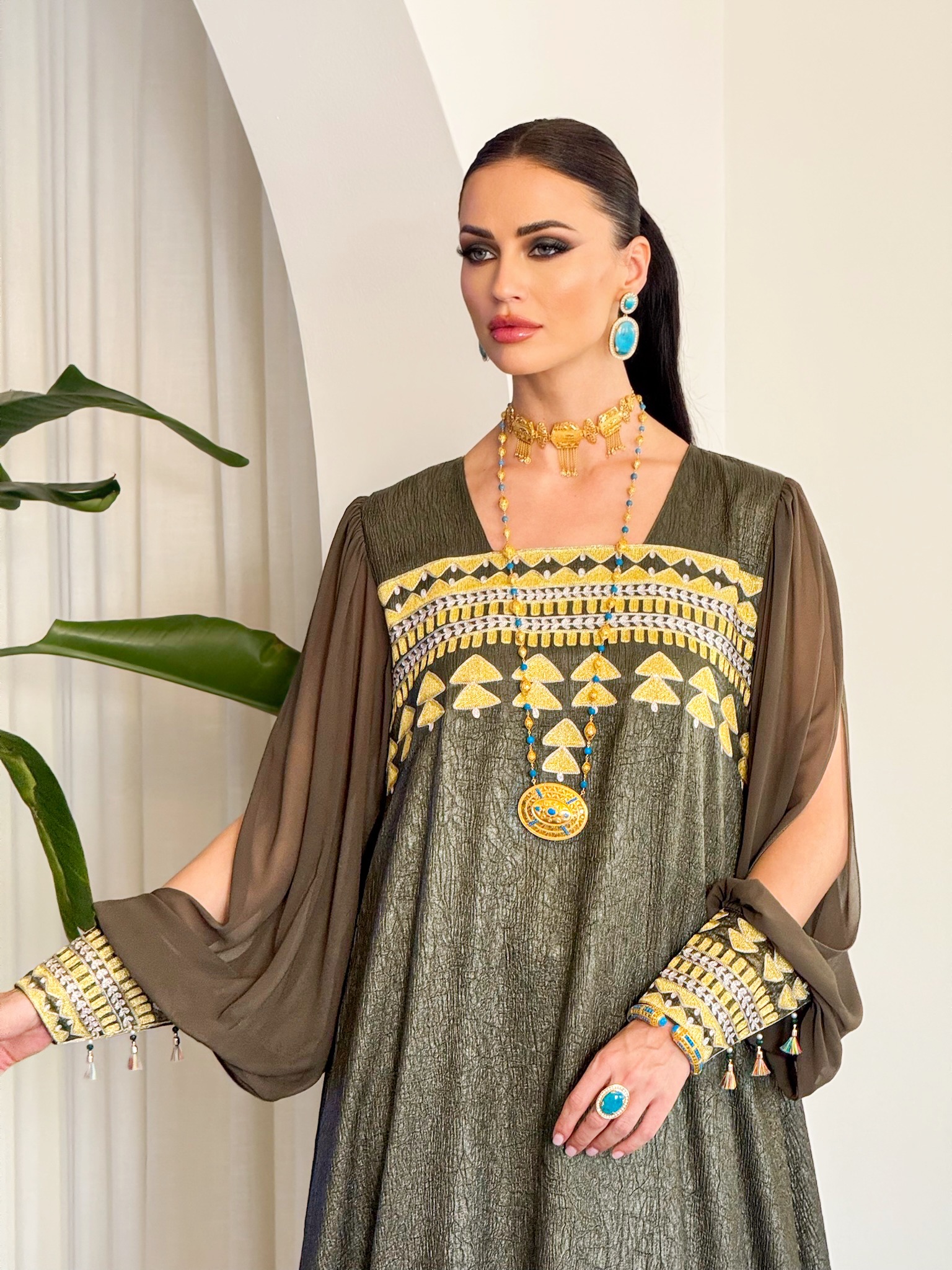 Two piece Kaftan set with fringe sleeves.